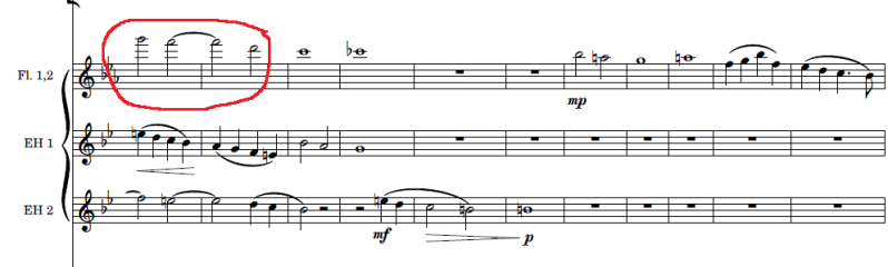 Hieronder ziet een mooi voorbeeld van een lieflijke toevoeging door de fluiten. Ze dubbelen eerst de sopranen in het koor, later de bassen. In eerst instantie spelen ze nog in hetzelfde octaaf, na 5 noten gaan ze omhoog naar hun eigen Hemelse octaaf. Ze benadrukken het liefdevolle karakter van Maria en herinneren aan de tijd dat Jezus werd geboren. De bassen herinneren mee. Een stukje verderop in mijn Matthäus, zult u gaan meemaken dat ik de luisteraar nog eens terug laat denken aan het Christuskind. Bedenk eens hoe gruwelijk dat eigenlijk is: een kind geboren laten worden met het doel om het aan het kruis te offeren, ook al leidt de kruisdood tot opstanding en is het uiteindelijk een verhaal van hoop.