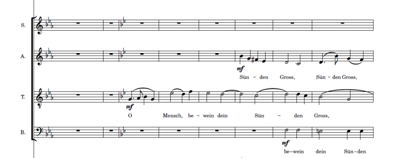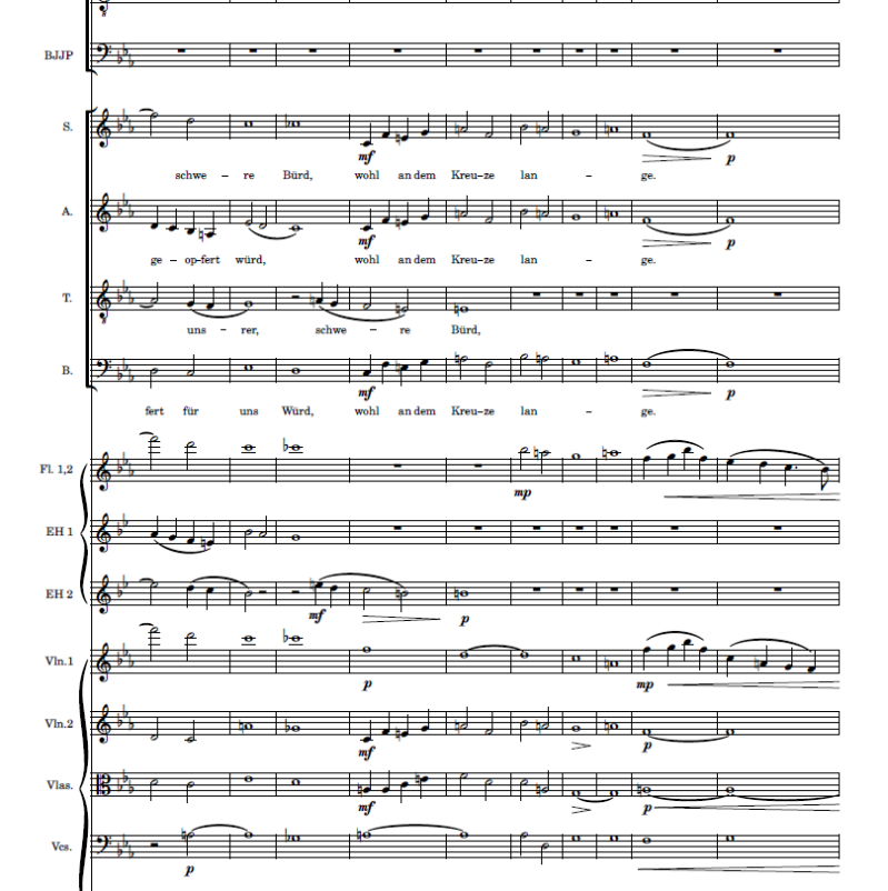 Vlak voor het eind van het openingskoor bevestigen koor, violen 1 en de altviolen de zin ‘wohl an den Kreuze lange’, in het koor gebeurt dit unisono in SAB. Ze eindigen op heel lange noten op ‘lange’ om dit weer te geven. Zie hieronder:
