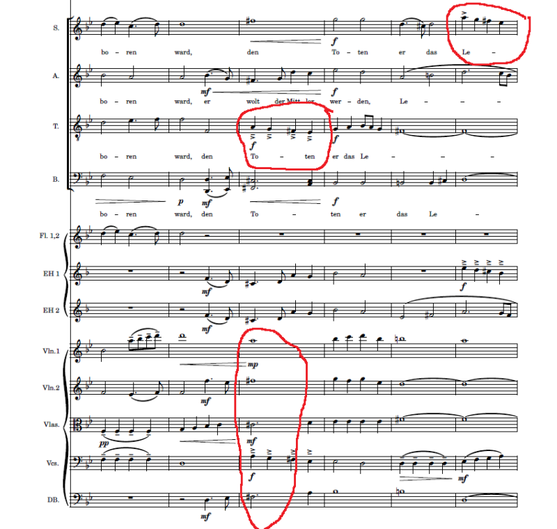 In ‘den Toten er das Leben gab’ komt er met een Fis-majeur akkoord en een grotere dynamiek plotseling meer emotionele lading in de muziek, u ziet het hieronder. Op een dieper niveau gaat dit stukje tekst over de onsterfelijkheid van de ziel: door zelf uit de dood op te staan, laat Jezus zien dat de gelovige ziel een reis naar boven kan maken. De dode wordt weer levend. In de partituur ziet u dit laatste idee terug doordat de hoge stemsoorten beiden hetzelfde dalende lijntje zingen. De tenor doet dat op het woord ‘Toten’ en de sopraan op het woord ‘Leben’. Zo staat de ziel op uit de dood. De bevestiging daarvan is het G-majeur akkoord waarmee de zin eindigt. (hier niet afgebeeld) Het hele koor èn orkest bevestigen dit, conclusio.