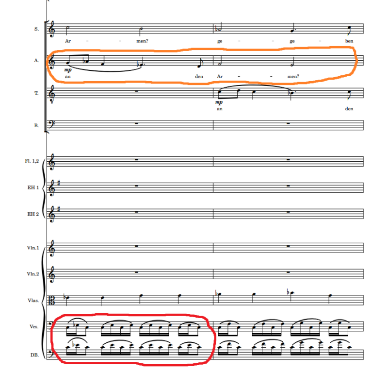 Daarna herhalen de sopranen dezelfde vraag en er ontstaat meerstemmigheid, u kunt het hieronder zien. Met die meerstemmigheid geef ik aan dat de leerlingen van Jezus door elkaar beginnen te praten. U kunt hier niet zien, dat de onrust wordt versterkt doordat de celli en contrabas noten met accenten hebben in een dalende lijn. Als u kijkt naar ‘Wasser’ ziet u dat dit hier ook verbeeld door meerdere snelle nootjes. Violen 2 spelen deze noten ook, legato om het stromende karakter van water te benadrukken. Uiteindelijk eindigt het koor éénstemmig op ‘Verkauft’ en plaatst het orkest een spannend akkoord tegen dat van het koor in. (niet afgebeeld) In dit akkoord speelde mijn synesthesie een rol. Ik zag een kleur voor mij en dat bepaalde hoe ik het akkoord ging inkleuren. Googled u nog eens op synesthesie en componisten als u nog eens tijd heeft, dat is best interessant.