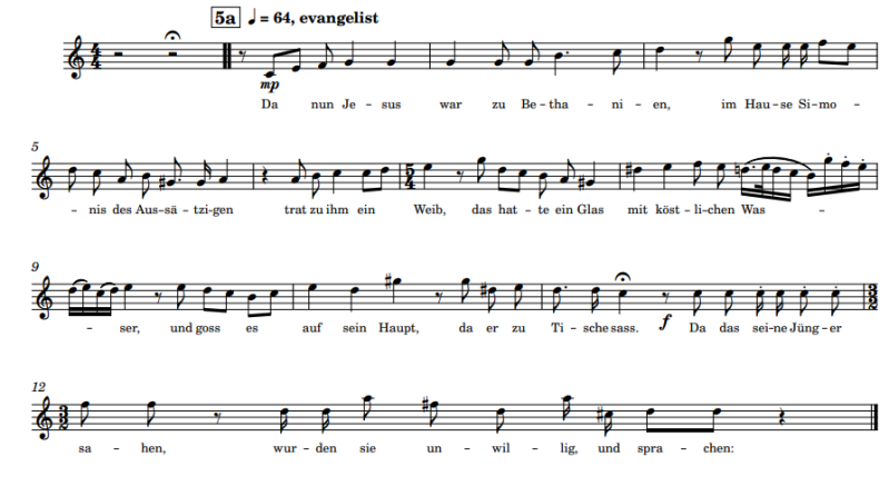 In deze Blog leg ik u uit, wat er in de muziek van dit recitatief en opvolgend turbae-koor is verwerkt is en waarom het in de muziek verwerkt is. De noten zijn niet zomaar noten, het eigenlijke verhaal speelt zich af achter de noten. Als u het wilt beluisteren, scroll dan naar de onderkant van deze Blog. Ik heb er met de computer een youtube-filmpje gemaakt om er u een idee van te geven. Dat heeft zijn beperkingen, u kunt daar onder componiste in één van de laatste alinea’s iets over lezen. Hieronder ziet u eerst de evangeliste aan het woord. U kunt het ook in filmpje zien en horen, maar het is voor het uitleggen handig als u het recitatief kunt overzien.