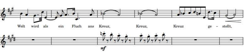In het orkest komt er ook een ‘ach Golgotha’ voor. Dat ziet u in de onderstaande afbeelding. Instrumenten kunnen natuurlijk niet letterlijk een tekst laten horen, maar ze kunnen dat wel muzikaal. De eerste paar noten in de althobo zijn dan ook echt een uitroep, om daarna weer decrescendo te maken. De althobo moet direct en pijnlijk hier het hart raken.