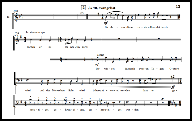 Zoals u ziet begint de evangeliste-sopraan in een 5/4 maatsoort. U kunt een blogartikel teruglezen over waarom de vijfkwartsmaat in alle recitatieven van de evangeliste terugkeert en waar het getal vijf naar refereert. Op Jesus laat ik haar versierend zingen: ik wil de luisteraar een beetje liefde voor Jezus laten voelen om deze later in de Matthäus beter kunnen te betrekken in het gevoel van compassio: het mede-lijden met Christus.