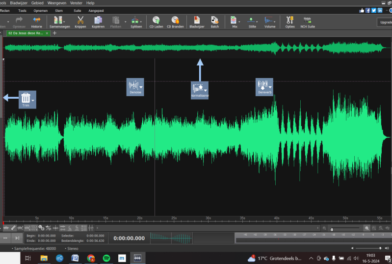 Wat valt verder op? De tekstherhaling op ‘gekreuziget’. Ik laat Jezus dat zingen met marcato-noten in fortissimo. Hij doet dat unisono met de strijkers en de fluiten. Het uitvoeren op deze manier herinnert aan de nagels waarmee hij aan het kruis geslagen wordt: iedere marcato-noot is een klap op een nagel. Ik moet toegeven, toen ik dat zo componeerde, werd ik er zelf erg emotioneel van. Ik zag het in beeld en geluid voor mijn ogen gebeuren. Als u kijkt naar het programma waarmee ik de mp3 bestanden voor de filmpjes nabewerk, ziet men in het beeld van de geluidsgolven heel duidelijk de klappen terug komen: